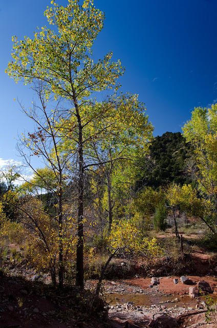 Zion National Park earned its name well...a Place of Refuge. As you drive into the canyon, you are surrounded by walls of mountains and beauty in all directions. John and I have fallen in love with these massive mountains, often talking about what it would be like to live near them. We planned this trip hoping to hit the fall color change, but, as it turns out, we were about 2 weeks early. There was some color change in the higher altitudes. I'll share some of those later. It was still beautiful and some of the photos we got are amazing. We got up and hiked every morning, then enjoyed relaxing time at the pool in the afternoons, great tasting meals at the local restaurants, and hot tub therapy for all my aching muscles in the evening!